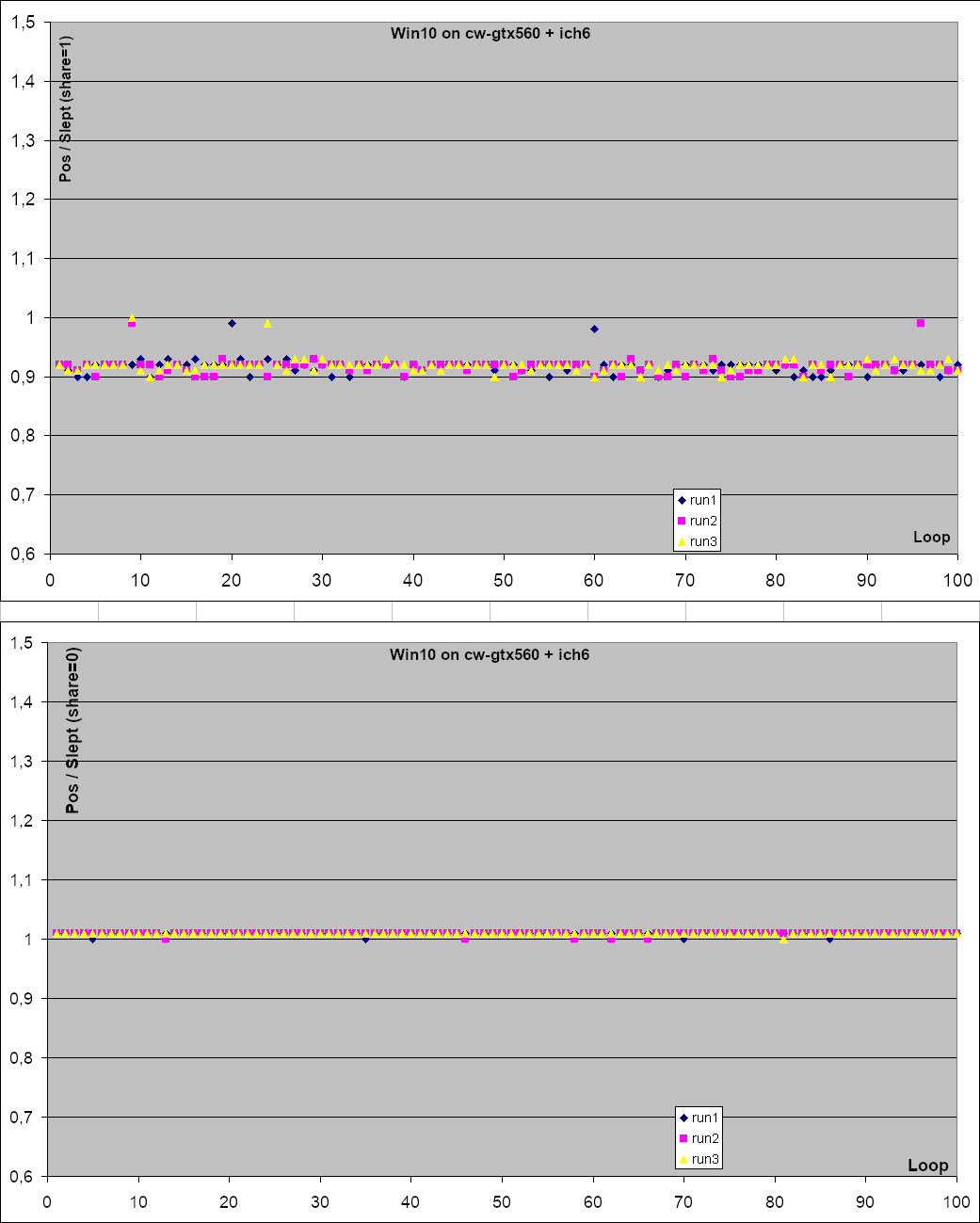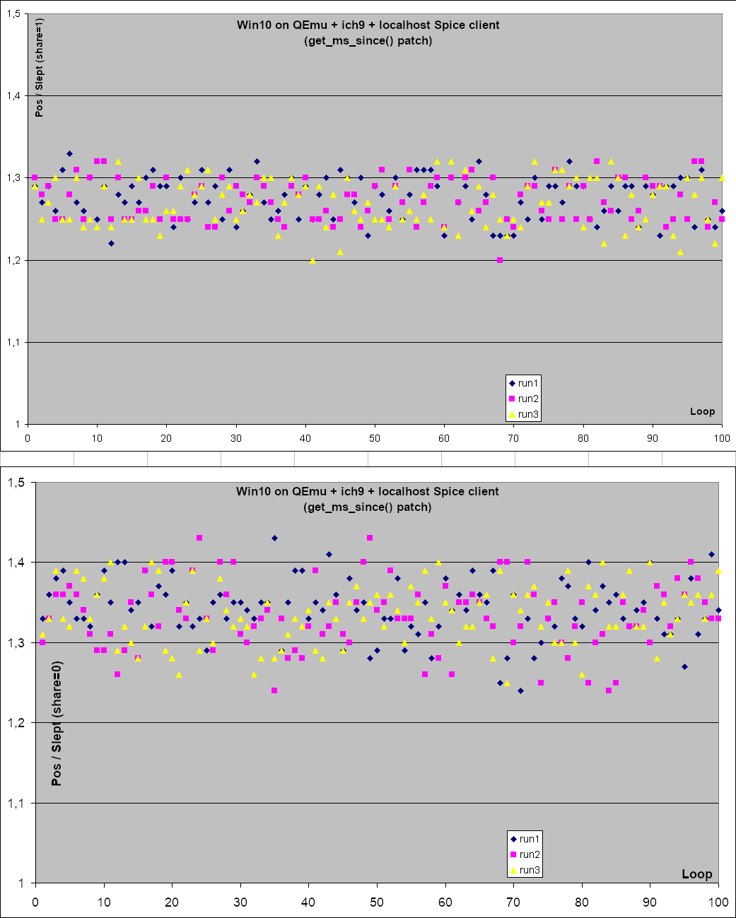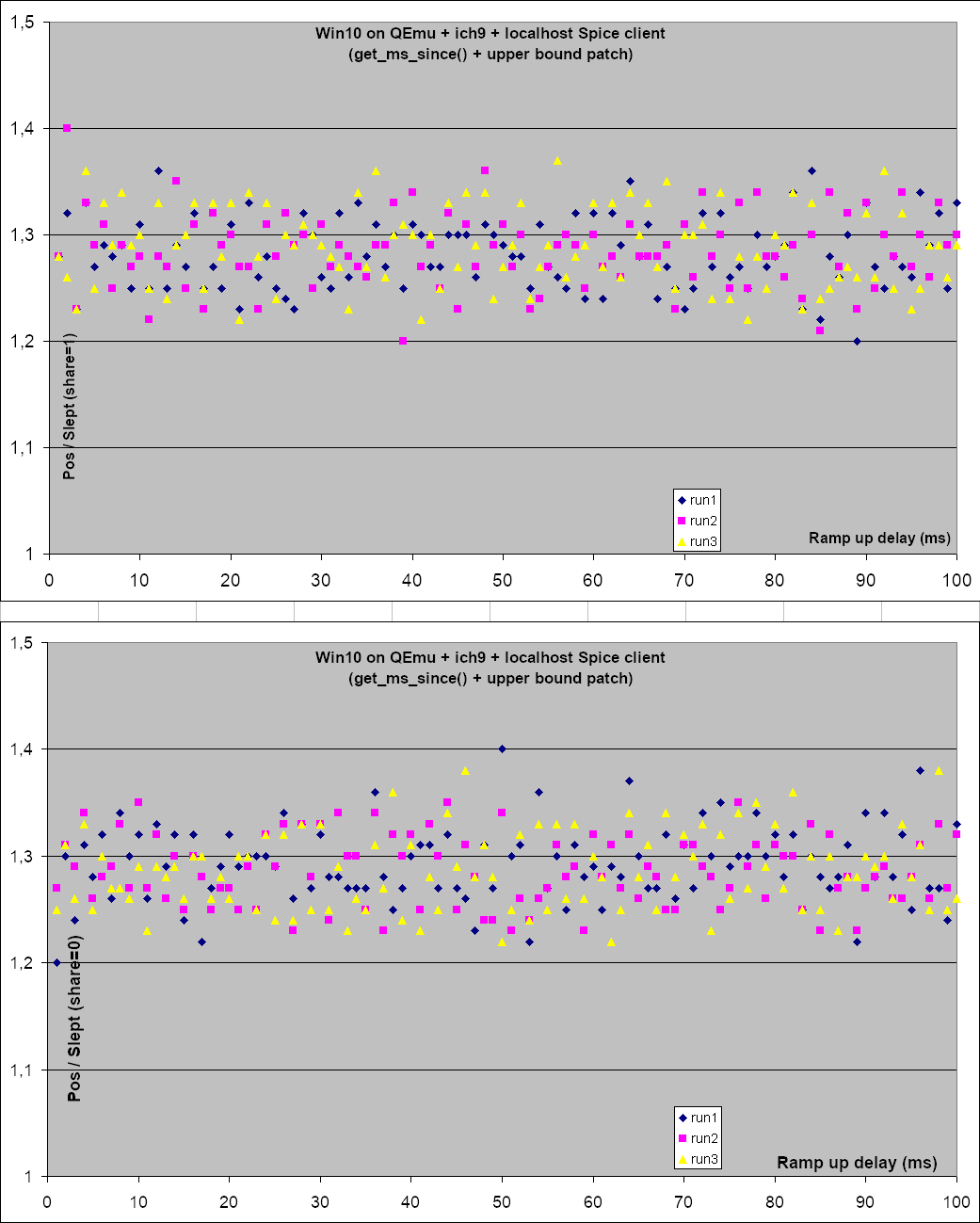 It's better with that patch but still fails quite often. To test this I focused on the first GetPosition() test, tweaked the ok() messages to show the position in milliseconds too, added a trace of the ratio of GetPosition() / slept (which we expect to be below 1.1 or at least 1.4), added a patch to loop 100 times over this test, and still did 3 runs. See the attached: 0001-mmdevapi-render-Trace-the-position-in-milliseconds-t.patch 0002-mmdevapi-render-Make-sure-to-get-an-upper-bound-on-t.patch 0003-mmdevapi-render-Loop-and-trace-ratio-between-positio.patch On Windows 10 in QEmu this shows the test still often goes above the 1.4 limit. See: since-win10+qemu+local.png So then I tweaked the slept interval to start right before the Start() call (which takes 1.5 to 3 ms), and end right after GetPosition() returns. This way we are sure that slept is an upper bound on the pos value. That improves the share=0 case but paradoxically the share=1 case sees more spread and higher values. There may have been more activity on the host but then I would have expected this to impact the share=0 case too. In each case we still get at least 1 value that's too high and many that are close: See: upper-win10+qemu+local.png (I also tested this with an ich6 virtual QEmu sound card but it made no difference) The same test on real hardware (Windows 10 on cw-gtx560) shows radically different results, results that are actually in line with the test expectations: See: upper-win10+gtx560.png So rather than just apply these patches and blindly increase the margin factor I dug some more to try to understand what is really going on. I'll try to get my theories and findings in shape in my next email. -- Francois Gouget <fgouget(a)codeweavers.com>