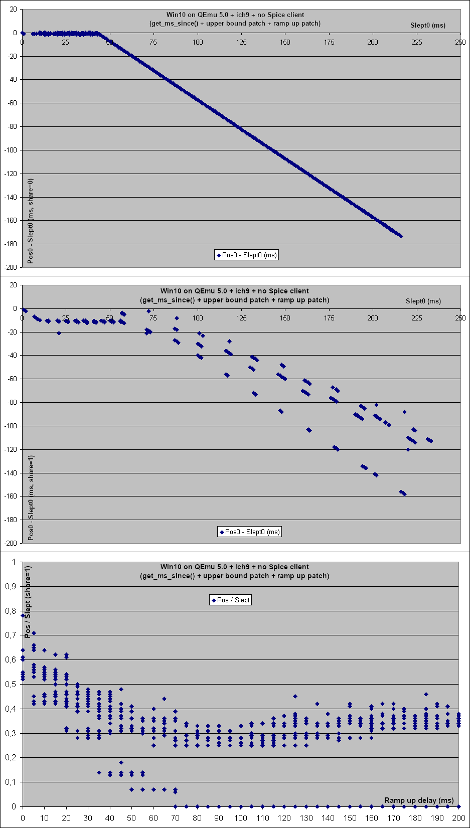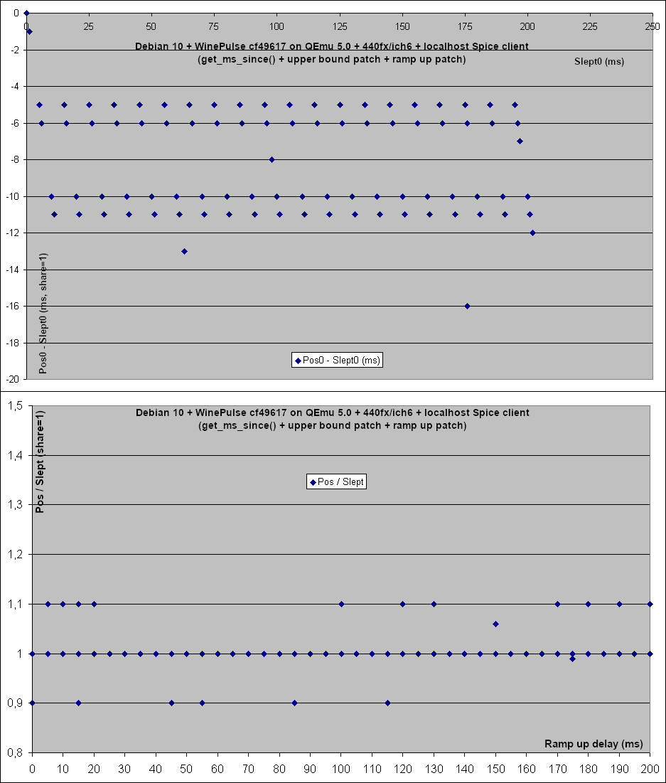 So my understanding is that on Windows things look like this: App -> Muxer -> driver -> soundcard But in QEmu the sound card is in fact something like this: QEmu -> Spice Server --network--> Spice client -> PulseAudio -> driver -> soundcard And in particular the Spice server to client communication requires some buffering to deal with the network jitter. So I suspected that the 'QEMU soundcard' would initially consume some audio to fill its buffer and then resume a normal rate. So I tweaked the test so it looked like this: Start() Sleep(25) last = GetPosition() Sleep(100) pos = GetPosition() compare pos - last to the expected value for 100 ms. The theory was that QEmu would fill its buffer during the initial 25 ms sleep and would play at a regular rate during the next 100 ms. That was indeed a bit better but not really. Increasing the initial sleep to 50 ms improved things a bit more. So I tweaked the test further to map out the effect of the initial sleep: * Increase the initial sleep (called RampUpDelay) from 0 to 200 ms in 5 ms increments. * For each run 40 tests. * Trace the position in milliseconds (Pos0) at the end of the initial sleep. Also trace the actual time spent sleeping (Slept0). * Then let the stream play for another 100 ms and measure how long we actually slept (Slept). * Get the final position (Pos) and trace the Pos / Slept ratio, which we expect to be below 1.1 (or 1.4 at the very least). Then I parsed the log to produce graphs that show the effect of the RampUpDelay on Pos0 - Slept0 and on the Pos / Slept ratio. I attached the corresponding patch which should be applied on top of the ones in the previous emails. You will also find all the data and graphs derived from these tests in the spreadsheet below: http://fgouget.free.fr/tmp/mmdevapi-render.xls And now here is an analysis of the results. Open the image attachements to follow along. * Win10 on real hardware : cw-gtx560 + ich6 Fig: render-cw.png - The first test configuration is what happens with real hardware, here the cw-gtx560 machine that runs WineTest daily. It has a very standard ich6 integrated audio soundcard which happens to match the sound card emulated by QEmu (ich6 or ich9). - The top graph shows the Pos0-Slept0 values when playing audio straight to the soundcard, that is when share=0. In that case Pos0-Slept0 is essentially 0. The way I understand it is that the Windows API queries the soundcard driver to report the soundcard's playback position within the soundcard buffer. - The other thing to notice is that although RampUpDelay is increased in 5 ms increments the top graph shows that the Slept0 values are really spread around. That proves Sleep() has at least a 5 ms jitter. In fact we already know from my past timers email that it's closer to 15 ms. - The second graph shows the Pos0-Slept0 values again but when going through the Windows muxer, i.e. the equivalent to PulseAudio. - This time Pos0-Slept0 stays close to -10 ms which presumably corresponds to the increments in which the muxer mixes the audio from the various sources. And there's a bit more variation (0 to -20 ms) when RampUpDelay is below 20 ms, most likely due to the muxer's buffering. - There are also a few stray points near the -30 ms mark. Maybe these correspond to scheduling issues (cw-gtx560 was obviously idle but there may still have been some Windows services doing their thing, although most are normally disabled). - Also there is less spread of the Slept0 values in the share=1 case: instead of a continous blur one sees short almost vertical lines. That contradicts the previous assertion about Sleep() jitter. Maybe the difference is that the Windows muxer changed the global Windows timer resolution. See timeBeginPeriod() and NtSetTimerResolution() and the previous timer dicussion: https://www.winehq.org/pipermail/wine-devel/2020-March/162846.html On a related note, see this blog post which implies the timer management has changed a lot in Windows 10 2004. All QEmu tests were done with Windows 10 2009 (aka 20H2) but the cw-gtx560 tests were run in Windows 10 <= 1909 so a global timer change in the muxer could have impacted the mmdevapi_test process. https://randomascii.wordpress.com/2020/10/04/windows-timer-resolution-the-gr... - The last graph shows that in the share=1 case the ratio stays very close to 1.0, except when RampUpDelay is less than 20 ms (i.e. the current test configuration) where it can be as low as 0.9 and as high as 1.1. These are probably the effect of the Windows muxer's initial buffering. - In the share=0 case the ratio stays very close to 1.0 all along so I did not attach the corresponding graph. * Win10 on QEmu 5.0 + ich9 + localhost Spice client Fig: render-spice-local.png - The test gives 500 ms worth of data to mmdevapi. But what we see in the top graph is that mmdevapi does not instantly slurps 40 ms worth of data. Rather Pos0-Slept0, i.e the amount that is buffered, increases progressively, which means the audio is being pulled at a somewhat higher than expected playrate. - Then after about 100 ms Pos0-Slept0 stabilizes between 25 and 45 ms. So in effect once the QEmu 'soundcard' has filled its buffer the playrate goes back to normal. - Note how the above actually matches the 1.4 ratio we have had to use in the mmdevapi:render test. - The graph in the middle is the same as the top one but indexed on Slept0, i.e. the real sleep wall time, rather than RampUpDelay, i.e. the parameter passed to Sleep(). It is at once similar and yet different from the graph above. In particular one can clearly see that initially Pos0-Slept0 is quantized. That probably has something to do with the audio being sent to the Spice client using the maximum size allowed by the Spice protocol initially. Then once the buffering target is reached, only enough data to refill the ~40 ms buffer is sent and that is more dependent on the actual time intervals and scheduling of the Spice server and client; resulting in a more random distrib