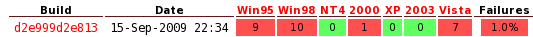 Hi, Just wanting to let you know that I'm down to 1% average failures on my Windows boxes (W95/W98/NT4/W2K/XP/W2K3/Vista). Short list: Sep-2009 : 1% Jun-2009 : 2% May-2009 : 3% Mar-2009 : 4% Feb-2009 : 5% So I doubt we get to zero before WineConf ;) -- Cheers, Paul.