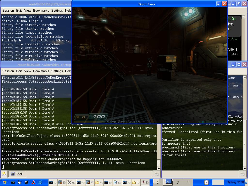 Hi, first the good news: the Doom3 demo is just running with current cvs! See screenshot. Wine is really growing mature, great work develolpers. I also own this game, and after applying a no-cd patch tried to run it. However it crashes after saying err:opengl:X11DRV_ChoosePixelFormat glXChooseFBConfig returns NULL (glError: 0) err:opengl:X11DRV_ChoosePixelFormat glXChooseFBConfig returns NULL (glError: 0) wine: Unhandled page fault on read access to 0x7d0962ac at address 0x4f94a6 (thread 0009), starting debugger...