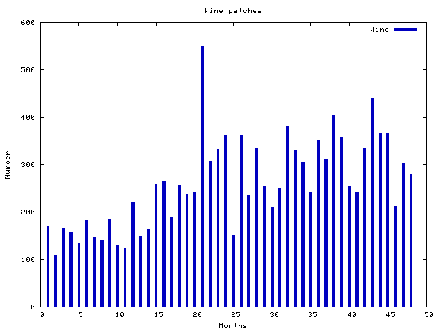 Fellow bean counters! On the weekend I wrote a quick script to generate a graph of the number of patches committed to the Wine CVS per month. The script and the graph it generates are attached. Anybody think it would be interesting to have a page of similar graphs on WineHQ somewhere that's regenerated once a month? Some ideas: patches committed to winehq per month patches sent to wine-patches per month unique patch authors vs. months lines of code committed per month lines of code sent per month ... Mike Dept of Time Wasting and (Mostly) Useless Statistics #!/usr/bin/perl # filename : winestat.pl # author : Mike McCormack # # A script to generate a graph with the number of patches against Wine per month. use strict; sub make_stat($) { my $month=$_[0]; my $winepatches=0; my $appdbpatches=0; my $lostwagespatches=0; my $cmd = sprintf("wget -q -O - http://www.winehq.org/hypermail/wine-cvs/%d.%02d.txt",$month/12 + 2001,$month%12+1); #print "$cmd\n"; open(IN,"$cmd|") || die "failed to run wget\n"; while(<IN>) { #print $_; if ( s/^Subject: *// ) { #print $_; if ( /^wine/ ) { $winepatches++; } elsif ( /^lostwages/ ) { $lostwagespatches++; } elsif ( /^appdb/ ) { $appdbpatches++; } else { #print "unknown module $_\n"; } } } printf(OUT "%d %3d %3d %3d\n", $month, $winepatches, $lostwagespatches, $appdbpatches); close IN; } my $month; open(OUT, ">stat"); for($month=1; $month<=(12*4+1); $month++) { make_stat($month); } close OUT; # <mike_m> it'd be nice to figure out how to get the x axis to display the date nicely # <papineau> set xdata time open (GNUPLOT, "|gnuplot"); print GNUPLOT "set title \"Wine patches\"\n"; print GNUPLOT "set xlabel \"Months\"\n"; print GNUPLOT "set ylabel \"Number\"\n"; print GNUPLOT "set term png xffffff x000000 x404040 x0000c0 xffa500 x66cdaa xcdb5cd\n"; print GNUPLOT "set boxwidth 0.3\n"; print GNUPLOT "set output \"winestat.png\"\n"; print GNUPLOT "plot \"stat\" using 1:2 title \"Wine\" w boxes fs solid 1\n"; #print GNUPLOT "plot \"stat\" using 1:2 title \"Wine\" w boxes fs solid 1, \\\n"; #print GNUPLOT " \"stat\" using 1:3 title \"Appdb\" w boxes fs solid 2, \\\n"; #print GNUPLOT " \"stat\" using 1:4 title \"LostWages\" w boxes fs solid 3 \n"; close GNUPLOT;