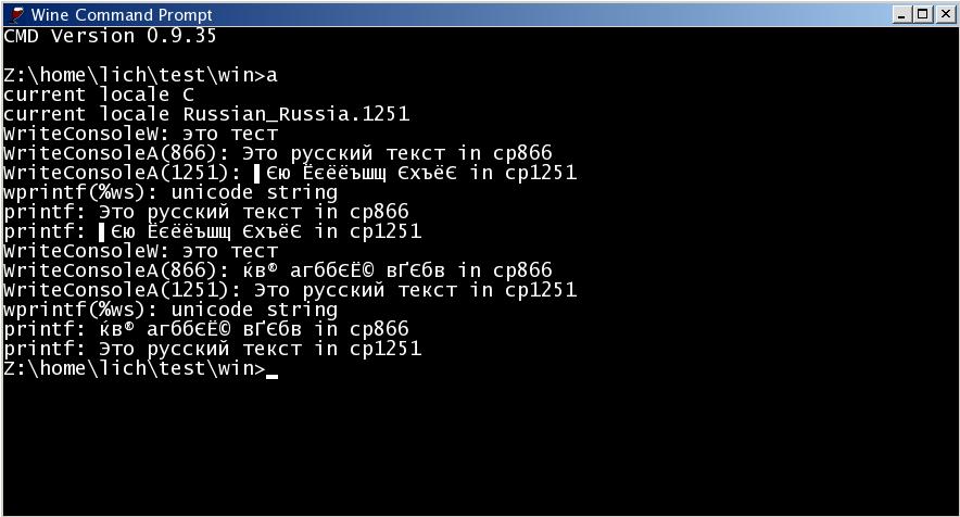 I'm attaching a modified version of your test, with some results/conclusions: I failed to compile it under mingw32 nor winegcc as-is: con_test_dmitry.c:33:21: converting to execution character set: Invalid or incomplete multibyte or wide character con_test_dmitry.c:50:21: converting to execution character set: Invalid or incomplete multibyte or wide character