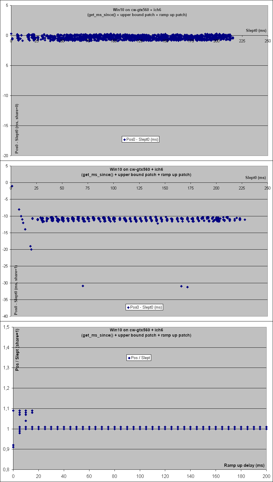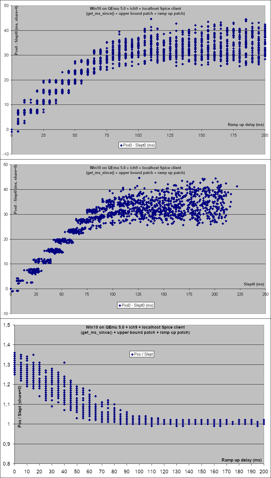 So my understanding is that on Windows things look like this: App -> Muxer -> driver -> soundcard But in QEmu the sound card is in fact something like this: QEmu -> Spice Server --network--> Spice client -> PulseAudio -> driver -> soundcard And in particular the Spice server to client communication requires some buffering to deal with the network jitter. So I suspected that the 'QEMU soundcard' would initially consume some audio to fill its buffer and then resume a normal rate. So I tweaked the test so it looked like this: Start() Sleep(25) last = GetPosition() Sleep(100) pos = GetPosition() compare pos - last to the expected value for 100 ms. The theory was that QEmu would fill its buffer during the initial 25 ms sleep and would play at a regular rate during the next 100 ms. That was indeed a bit better but not really. Increasing the initial sleep to 50 ms improved things a bit more. So I tweaked the test further to map out the effect of the initial sleep: * Increase the initial sleep (called RampUpDelay) from 0 to 200 ms in 5 ms increments. * For each run 40 tests. * Trace the position in milliseconds (Pos0) at the end of the initial sleep. Also trace the actual time spent sleeping (Slept0). * Then let the stream play for another 100 ms and measure how long we actually slept (Slept). * Get the final position (Pos) and trace the Pos / Slept ratio, which we expect to be below 1.1 (or 1.4 at the very least). Then I parsed the log to produce graphs that show the effect of the RampUpDelay on Pos0 - Slept0 and on the Pos / Slept ratio. I attached the corresponding patch which should be applied on top of the ones in the previous emails. You will also find all the data and graphs derived from these tests in the spreadsheet below: http://fgouget.free.fr/tmp/mmdevapi-render.xls And now here is an analysis of the results. Open the image attachements to follow along. * Win10 on real hardware : cw-gtx560 + ich6 Fig: render-cw.png - The first test configuration is what happens with real hardware, here the cw-gtx560 machine that runs WineTest daily. It has a very standard ich6 integrated audio soundcard which happens to match the sound card emulated by QEmu (ich6 or ich9). - The top graph shows the Pos0-Slept0 values when playing audio straight to the soundcard, that is when share=0. In that case Pos0-Slept0 is essentially 0. The way I understand it is that the Windows API queries the soundcard driver to report the soundcard's playback position within the soundcard buffer. - The other thing to notice is that although RampUpDelay is increased in 5 ms increments the top graph shows that the Slept0 values are really spread around. That proves Sleep() has at least a 5 ms jitter. In fact we already know from my past timers email that it's closer to 15 ms. - The second graph shows the Pos0-Slept0 values again but when going through the Windows muxer, i.e. the equivalent to PulseAudio. - This time Pos0-Slept0 stays close to -10 ms which presumably corresponds to the increments in which the muxer mixes the audio from the various sources. And there's a bit more variation (0 to -20 ms) when RampUpDelay is below 20 ms, most likely due to the muxer's buffering. - There are also a few stray points near the -30 ms mark. Maybe these correspond to scheduling issues (cw-gtx560 was obviously idle but there may still have been some Windows services doing their thing, although most are normally disabled). - Also there is less spread of the Slept0 values in the share=1 case: instead of a continous blur one sees short almost vertical lines. That contradicts the previous assertion about Sleep() jitter. Maybe the difference is that the Windows muxer changed the global Windows timer resolution. See timeBeginPeriod() and NtSetTimerResolution() and the previous timer dicussion: https://www.winehq.org/pipermail/wine-devel/2020-March/162846.html On a related note, see this blog post which implies the timer management has changed a lot in Windows 10 2004. All QEmu tests were done with Windows 10 2009 (aka 20H2) but the cw-gtx560 tests were run in Windows 10 <= 1909 so a global timer change in the muxer could have impacted the mmdevapi_test process. https://randomascii.wordpress.com/2020/10/04/windows-timer-resolution-the-gr... - The last graph shows that in the share=1 case the ratio stays very close to 1.0, except when RampUpDelay is less than 20 ms (i.e. the current test configuration) where it can be as low as 0.9 and as high as 1.1. These are probably the effect of the Windows muxer's initial buffering. - In the share=0 case the ratio stays very close to 1.0 all along so I did not attach the corresponding graph. * Win10 on QEmu 5.0 + ich9 + localhost Spice client Fig: render-spice-local.png - The test gives 500 ms worth of data to mmdevapi. But what we see in the top graph is that mmdevapi does not instantly slurps 40 ms worth of data. Rather Pos0-Slept0, i.e the amount that is buffered, increases progressively, which means the audio is being pulled at a somewhat higher than expected playrate. - Then after about 100 ms Pos0-Slept0 stabilizes between 25 and 45 ms. So in effect once the QEmu 'soundcard' has filled its buffer the playrate goes back to normal. - Note how the above actually matches the 1.4 ratio we have had to use in the mmdevapi:render test. - The graph in the middle is the same as the top one but indexed on Slept0, i.e. the real sleep wall time, rather than RampUpDelay, i.e. the parameter passed to Sleep(). It is at once similar and yet different from the graph above. In particular one can clearly see that initially Pos0-Slept0 is quantized. That probably has something to do with the audio being sent to the Spice client using the maximum size allowed by the Spice protocol initially. Then once the buffering target is reached, only enough data to refill the ~40 ms buffer is sent and that is more dependent on the actual time intervals and scheduling of the Spice server and client; resulting in a more random distrib