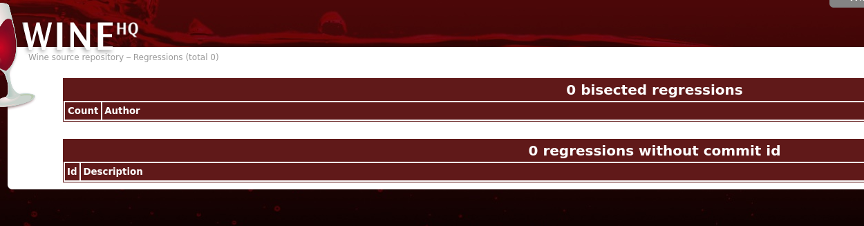 [1] https://source.winehq.org/regressions [2] https://list.winehq.org/mailman3/hyperkitty/list/wine- devel(a)winehq.org/thread/QOYOIJHTGVUDCFZF2MQ7KFT6A7BFNS7Z/ [3] https://list.winehq.org/mailman3/hyperkitty/list/wine- devel(a)winehq.org/thread/7CDUAWL5DWFKXKIZL2WGWU7DNFFR3IP6/ [4] https://web.archive.org/web/20240915073049/https:// source.winehq.org/regressions