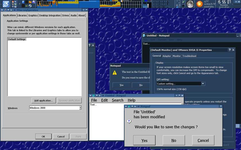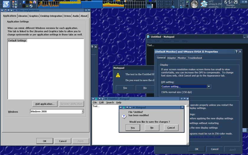 Yes, and in both Windows and current WINE (without the patch) this looks very good (as it should) on my 22" display! Just compare attached screenshots (please note that I have scaled down them by 50% in order to save the bandwidth). "broken.jpg" shows problem I'm talking about. This is with clean WINE with clean WINEPREFIX *with* applied last version of patch that was sent to me privately. As you can see, notepad's dialog and its menu is of ridiculously big size! Behind notepad and winecfg you can see Windows with default font size but with DPI set to 150 (WINE DPI setting is same). Menu in notepad and its dialog is of normal size in Windows, everything looks very nice. Note that all fonts in Windows are of same size no matter what DPI I set there. "clean.jpg" is made using clean WINE with clean WINEPREFIX with LogPixels set to 150 DPI. Behind you can see Windows (in VMWare). Please note that because of clean WINEPREFIX fonts are somewhat different but their system-default size and DPI setting in WINE and Windows are the same here. As you can see, with clean WINE without the patch everything looks as it should. Even the dialog box in both WINE and Windows is of almost same size ("almost" because of somewhat different fonts and different titlebars). This proofs correct behavior of current clean WINE and shows that it respects LogPixels value correctly. My impression is that the patch Ivan Sinitsin proposing is a hack to make font size in menu/dialog/status bar bigger in every application because 1C application displays smaller fonts there than others. But in its current state this hack is very destructive (as you can see in above example). And of course if on Windows 1C applications behaves in the same way WINE should behave like this too. In fact I have seen (and even use some of them on regular basis) Windows applications which set small font size in some GUI elements even with big DPI setting so I will not be surprised if 1C application in question is just another one.