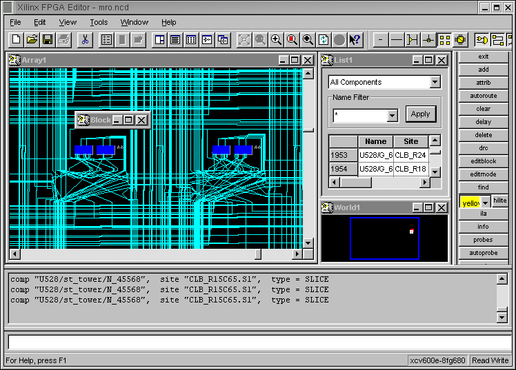With Xilinx fpga editor, I see one problem. When I double click one of the blue squares in the array window, a block window shows up. But with the patch, it is showing up sort of minimized, as shown.