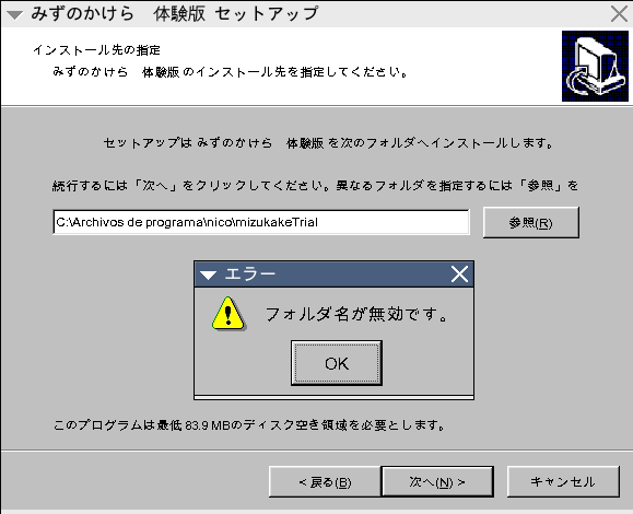 There is a Japanese RPG I am trying to install, which I downloaded from: http://www.i-o.jp/game/mizukake/mizukake_trial.zip This installer runs fine under Windows 98, but fails in Wine. I believe this to be some kind of trivial error, but I cannot read Japanese, so I am unable to diagnose what is going wrong with this installer. A screenshot of the error message is attached. Could somebody who can read Japanese please translate this screenshot for me, so that I can know what is the issue the installer is complaining about? Alex Villacís Lasso