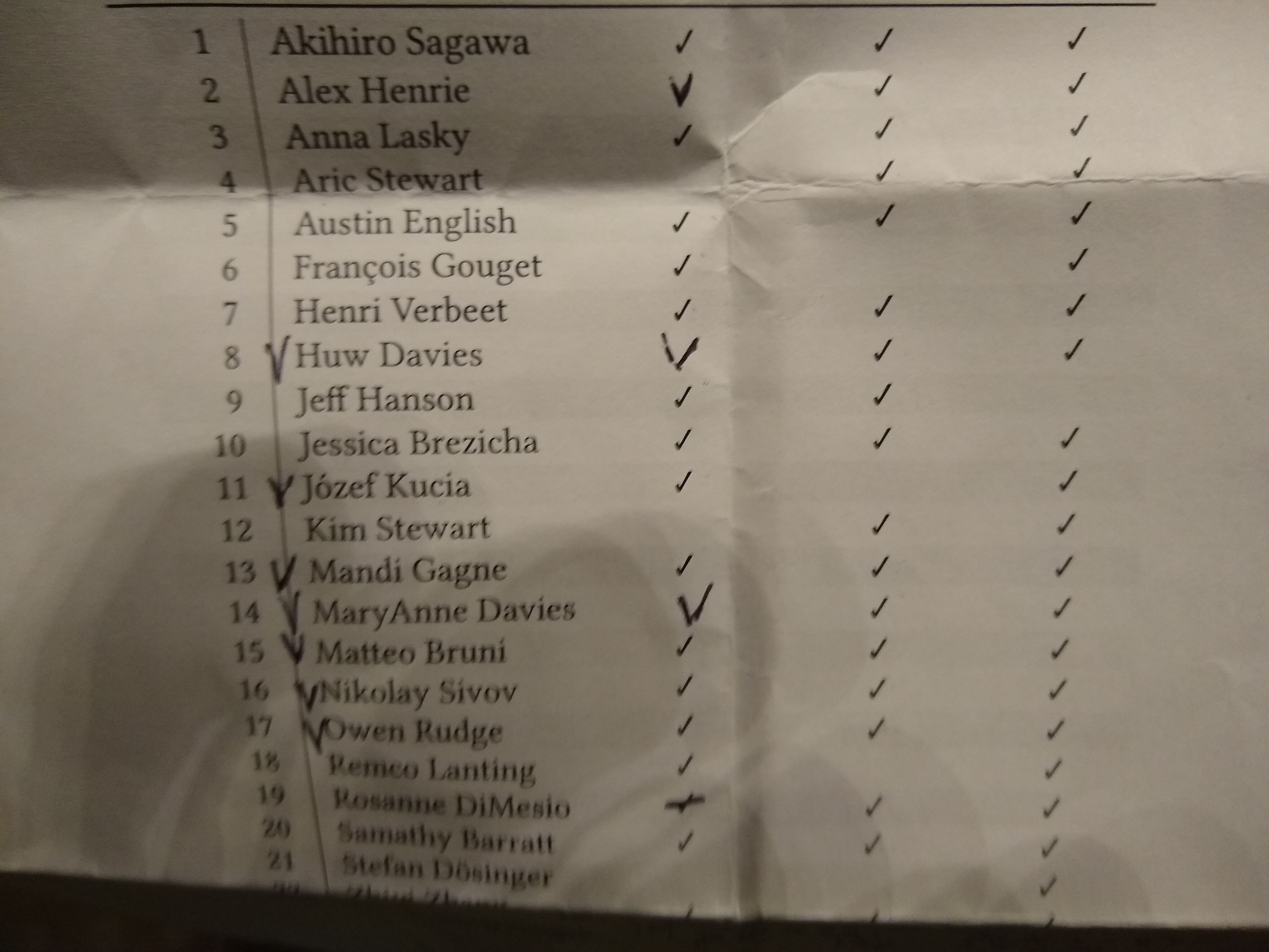 So if you signed up for dinner tonight, that will be at 7:00. There is room for two more with that group. Otherwise, you are on your own; a good plan will be to form up in the lobby through the afternoon and evening. The list is attached, and Bradley is in. Cheers, Jeremy On June 29, 2018 4:06:23 PM GMT+02:00, Hana Pagel <hpagel(a)codeweavers.com> wrote: